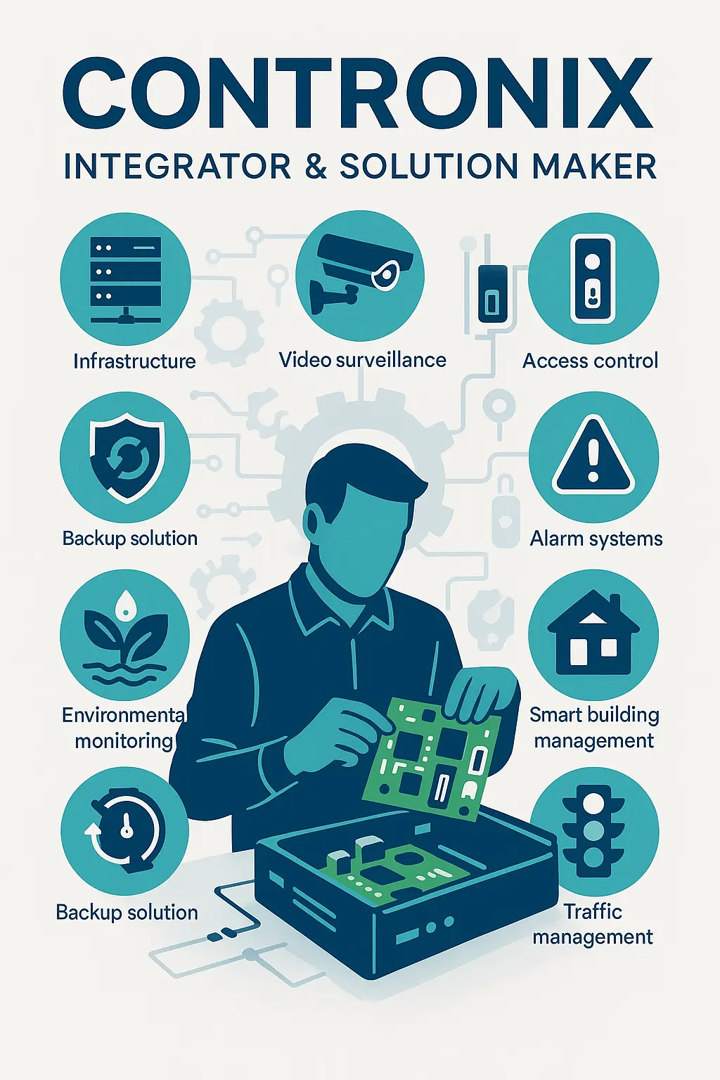 At Contronix, we pride ourselves on being a leading integrator and solution maker, dedicated to offering bespoke products and intelligent solutions. Our extensive experience across various industries, combined with our up-to-date knowledge and deep connections with cutting-edge manufacturers, enables us to provide a wide range of solutions. From infrastructure network solutions to video surveillance security, targeted surveillance applications, access control, alarm systems, home and commercial smart building management, traffic management, environment monitoring, and backup solutions, we have it all covered.